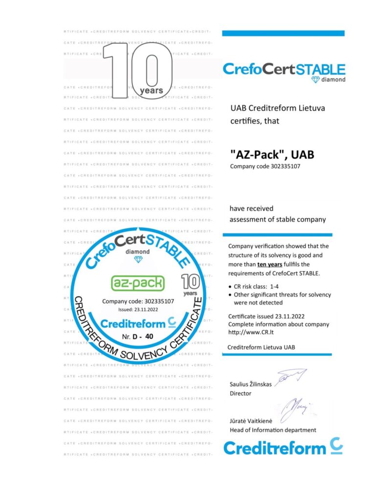 Šis sertifikatas – finansinio patikimumo ženklas ir oficialus UAB Creditreform Lietuva patvirtinimas, kad „AZ-Pack” UAB – stabili įmonė turinti ypatingai gerą mokumo struktūrą daugiau nei dešimt metų ir išlaiko aukštus, šiam sertifikatui keliamus pastovumo reikalavimus.